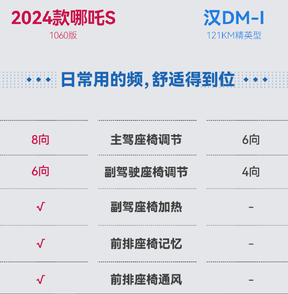 再看乘坐舒适性,哪吒S 1060版可谓全面碾压比亚迪汉DM-i。座椅调节方面,哪吒S 1060版支持主驾座椅8向调节,副驾驶座椅6向调节。比亚迪汉DM-i则仅支持主驾座椅6向调节,副驾驶座椅4向调节。而且哪吒S 1060版还提供比亚迪汉DM-i所不具备的副驾座椅加热、前排座椅记忆和前排座椅通风功能;隔音方面,哪吒S 1060版配备四门夹层6mm超厚隔音玻璃,超越比亚迪汉DM-i的仅前排配备隔音玻璃。与30多处空腔隔断相配合,哪吒S 1060版打造出剧院级的静谧车身空间,即便在120km/h高速下,车内语言清晰度也能超过86%。