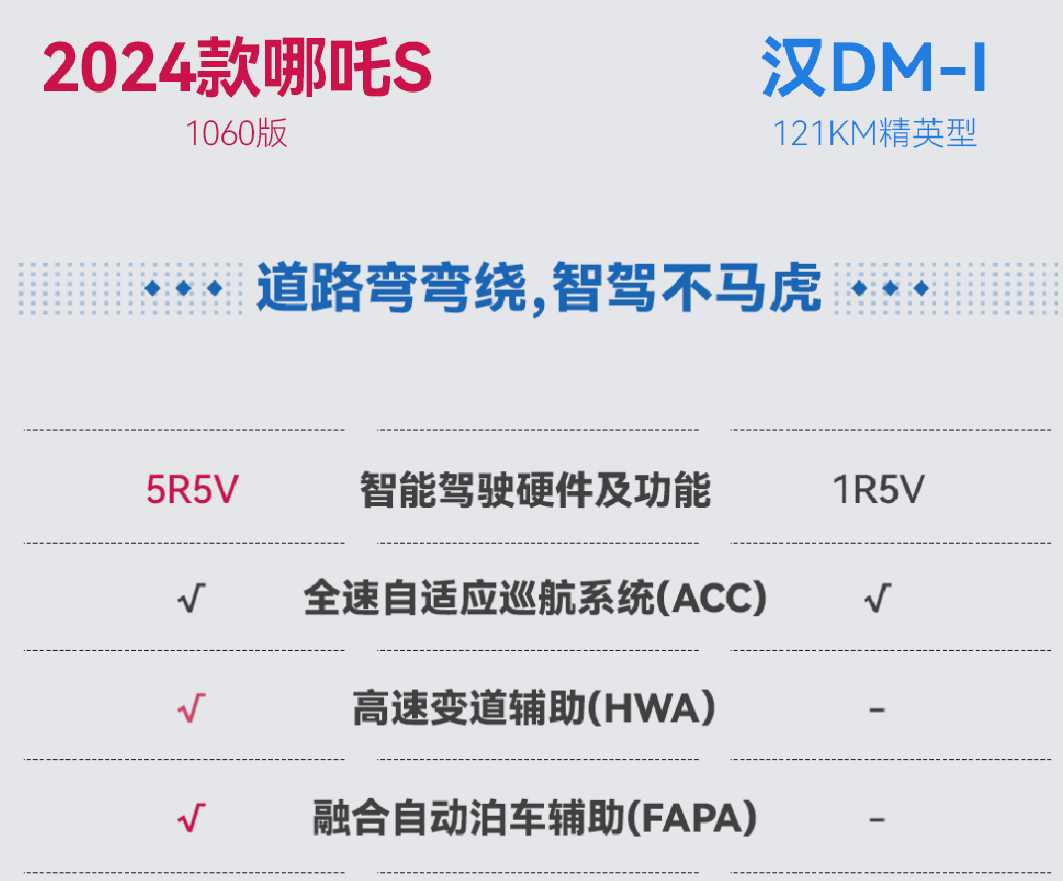 与仅配备1颗毫米波雷达和1颗摄像头的比亚迪汉DM-i相比,哪吒S 1060款无论是摄像头数量,还是高速变道辅助(HWA)、融合自动泊车辅助(FAPA)等比亚迪汉DM-i无法企及的智驾辅助功能,都表现出越级突破的积极性。