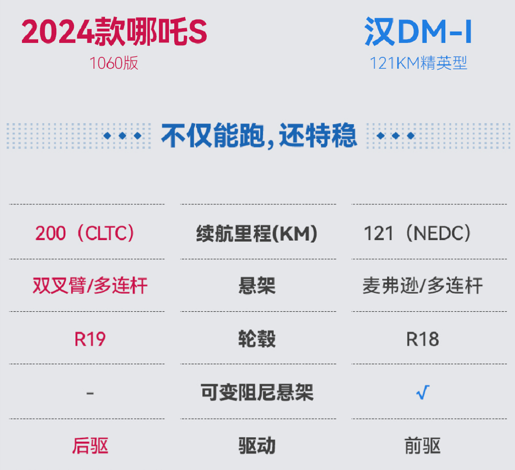 那么,哪吒S 1060版这一超帅轿跑,究竟在现有市场环境中表现如何?能否承担起消费者对其的期待?我们现在就将2024款哪吒S 1060版与卖的比较好的比亚迪汉DM-i冠军版121km精英型(以下简称“比亚迪汉DM-i”)做个比较,看看2024款哪吒S 1060版真实的表现如何?让产品自己来说话!