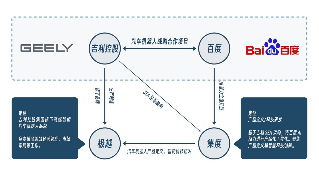 吉利控股与百度在2021年启动“汽车机器人战略合作项目”,率先成立了集度。集度作为一家AI科技公司并不直接造车,而是聚焦智能汽车产品定义与AI智能科技创新,基于吉利SEA浩瀚架构,将百度AI技术在智能汽车领域进行产品化和工程化,提供汽车高阶智能化完整解决方案。