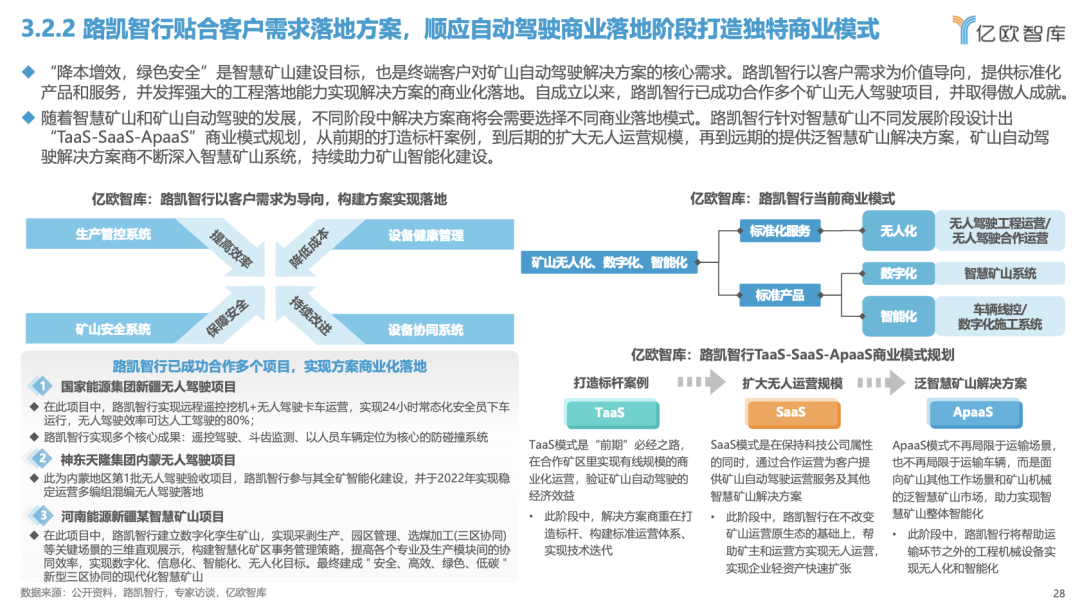 《报告》指出,“降本增效,绿色安全”是智慧矿山建设目标,也是终端客户对矿山自动驾驶解决方案的核心需求。路凯智行以客户需求为价值导向,提供标准化产品和服务,并发挥强大的工程落地能力实现解决方案的商业化落地。并针对智慧矿山不同发展阶段设计出“TaaS-SaaS-ApaaS”商业模式规划,不断深入智慧矿山系统,持续助力矿山智能化建设。