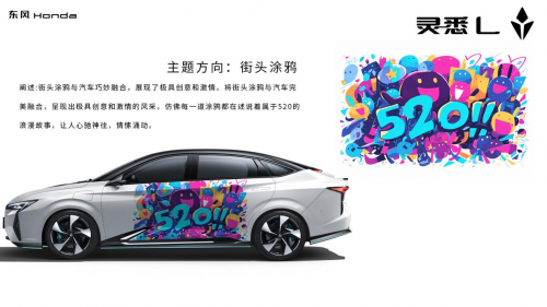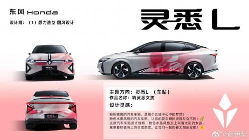 灵悉L采用由东风Honda年轻化团队原生设计,呈现出独特个性的外观特点,有棱有角的多面体造型和新颖的灯光设计,仿佛来自未来的机甲战机。这一风格也为参赛者们带来了很多涂鸦的设计的灵感。不少设计作品采用了宇宙飞行器、星球、游戏等元素,用高饱和度的色彩,呈现出潮流时尚的视觉风格,也反映出当代年轻人的审美趣味和丰富的精神生活。