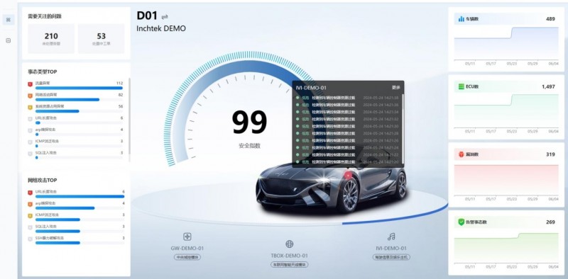 ·关键指标集成:整合未处理告警、待处理工单、车型状况、漏洞统计,实时展现车型安全状况