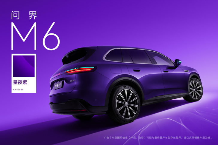 问界M6由华为设计力量全流程主导,遵循“极致、简约、纯净”美学原则,传承家族展翼设计并创新演绎,车身尺寸4960×1985×1736mm,轴距2950mm,兼顾SUV体量与轿跑动感。前脸俯冲姿态鲜明,晶曜大灯与尾灯单侧各含千颗晶钻折射体,AITO字样融入尾灯,辅助驾驶激活时前保险杠、后视镜、尾灯小蓝灯同步亮起。车身侧面光影丰富,提供星夜紫等七款外饰配色,采用五涂层油漆工艺,可选装黑曜运动套件,搭配20/21英寸共五种轮毂。 内饰为环抱式沉浸座舱,类机车造型中控呈对称布局,搭配D型方向盘与一体式运动座椅,提供紫慕白等四款内饰配色,17处可调节氛围灯搭配2.352m²全景天幕+直驱式电动遮阳帘;主副驾配备318×100mm超大化妆镜,支持三档色温与亮度调节。