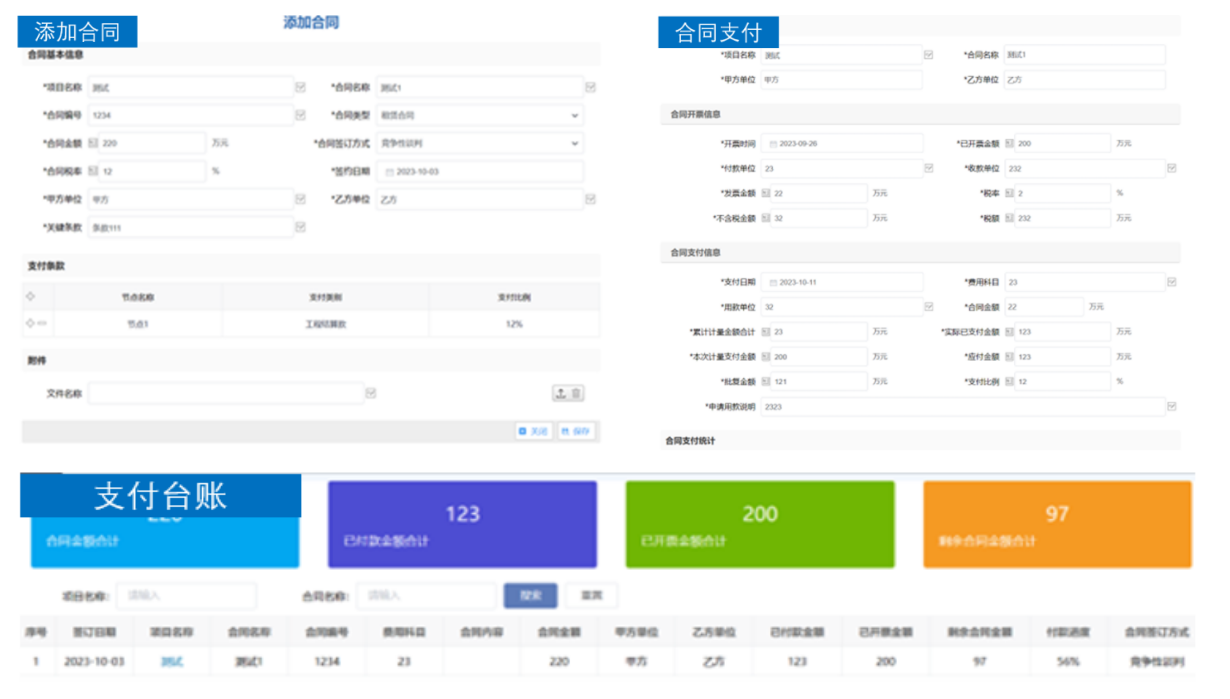 针对合同管理,中威电子平台全生命周期对企业项目合同涉及的合同审批、合同归档、合同执行、合同报表进行全程数字化管理,并通过建设合同台账,可视化合同的种类、合同数量、合同支付情况,支持与OA、财务等业务的融合,为企业自动触发付款、报销、开票等事务。
