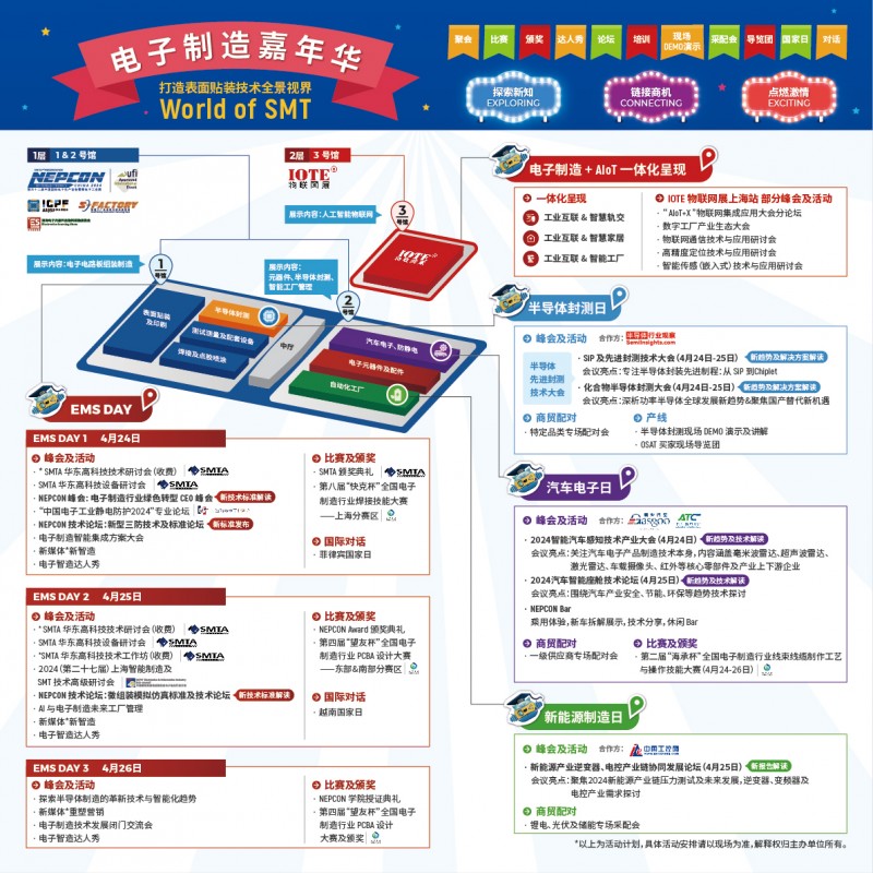 针对汽车电子、半导体封装、新能源制造等重点高端行业产业集群,展会将创新举办“EMS Day”“半导体封测”“汽车电子”“新能源制造”行业主题日,通过展示、会议与商贸配对相结合的形式,为电子制造企业提供了优化供应链、节约成本、提高竞争力的宝贵机会。