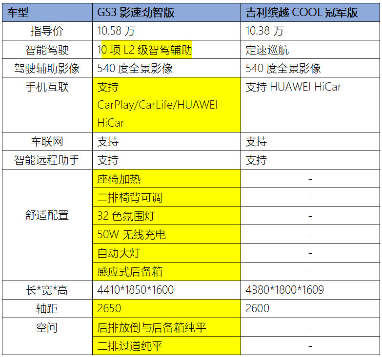 市场到底卷到什么程度了?手握10万预算都能买到什么配置呢?接下来我们将通过对比两款紧凑型SUV——传祺GS3影速劲智版、吉利缤越COOL冠军版,来了解一下入门级SUV之间的配置差异: