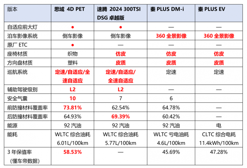 四款车型在配置方面各有千秋,总的来说,思域和速腾更注重驾驶者的实际使用需求,L2级别的辅助驾驶在安全方面给到足够的安心体验;秦PLUS则偏重乘坐舒适性配置,例如在内饰材质上更考究,搭载360全景影像等。而在模拟用车费用的测算中,思域靠着高保值率,当选为“省钱王”。